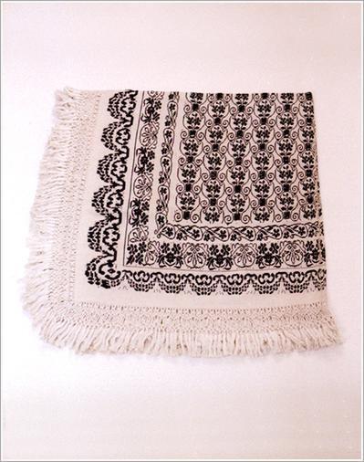 Origin: Békéscsaba Technique: Raw coloured flax homespun, sewed from two sheets, made of black cotton, weaved motifs. Size: L: 155 cm W: 150 cm