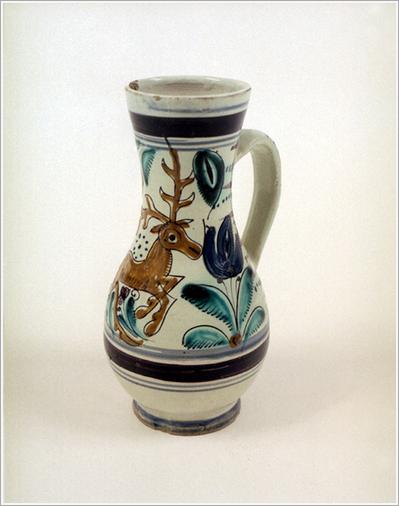 "Origin: Tótkomlós Technique: Has the special effect of ""habán"", white glazed, wide orifice, with brownish violet and blue cross stripes, yellow deer on the two sides, and blue, green flowers. Size: H: 21.5 cm Orifice: 7 cm Bottom: 7 cm"