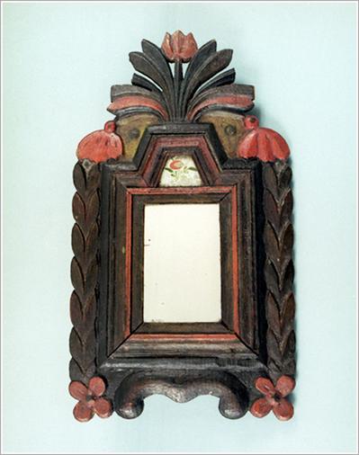 Origin: Tótkomlós Technique: Carved from pine-wood, double-framed mirror, dissected inner frame, convex carving on the top. Size: W: 28 cm H: 50 cm