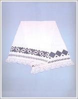 festive towel Origin: Tótkomlós Technique: White cotton homespun with cross-fibred stripes on both ends, narrow ham-stiching on one end. Size: L: 179 cm W: 95 cm |