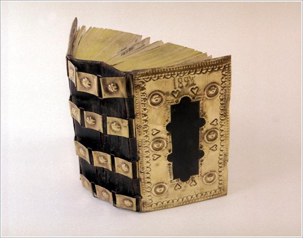 "Origin: Békéscsaba Technique: Lutheran book of songs printed in Czech with Gothic letters, copper fittings and convex, dotted ornaments on the cover.""1895"" Size: L: 19 cm W: 12 cm H: 8.5 cm"