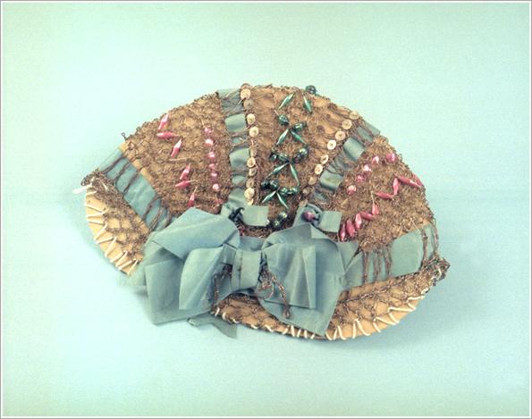 Origin: Békéscsaba Technique: Crocheted from silver yarn, decorated with flitteres and pearls, tied with blue silk ribbon. Size: L: 28 cm W: 13 cm