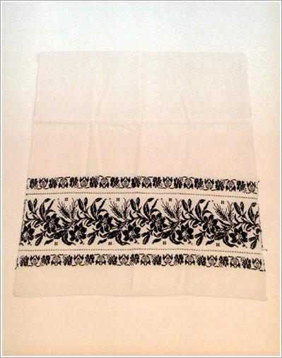 Origin: Békéscsaba Technique: White homespun made of hemp and cotton, between two drawn stripes wide strap with black, cross-fibred motifs of flowers at one end. Size: L: 86.5 cm W: 56 cm