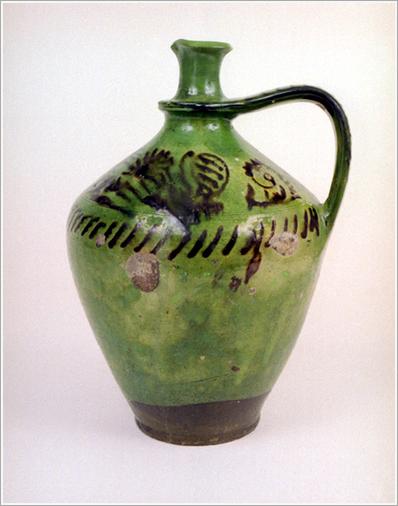 Origin: Békéscsaba Technique: Green glazed, one handled ceramic pot with black ornaments drawn with a stick. Size: H: 30 cm Bottom: 11 cm