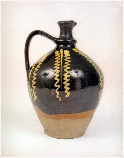 Origin: Békéscsaba Technique: Dark brown glazed, with yellow ornaments drawn with a stick, one handled ceramic pot. Size: H: 26 cm Bottom: 9 cm