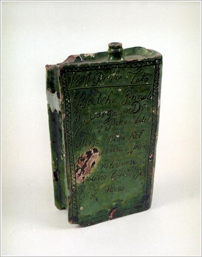 "Origin: Tótkomlós Technique: Shape of a book, green glazed. Carved Slovakian writing on one side, engraved flowers on the other and ""1871"" Size: H: 19.5 cm Orifice 7.5 Bottom: 10.5 cm"