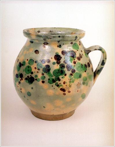 Origin: Szarvas Technique: One handled, bellied, yellow-glazed storing pot with run ornaments. Size: H: 20 cm Bottom: 23 cm