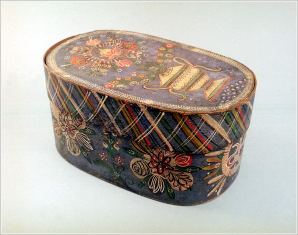"Origin: Békéscsaba Technique: oval chest with a lid made of soft-wood, ornaments of hand-painted flowers, fixed on it: ""IHS"" Size: L: 37 cm H: 20 cm"