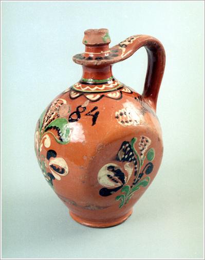 "Origin: Tótkomlós Technique: Flat sides, one-handled, bellied, brown-glazed bottle with green, black and white ornaments drawn with a stick, writing: ""1884"" Size: 25 cm Bottom: 9 cm"