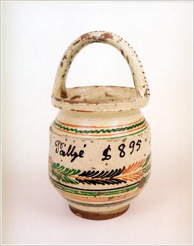 "Origin: Csanádalberti Technique: Yellow-glazed, pot-shaped with a round handle on the top. Ornamented with narrow leaves and cross stripes around , writing: ""Antalecz Pállyé 1895 Alberi"" Size: H: 33 cm Bottom: 22 cm"