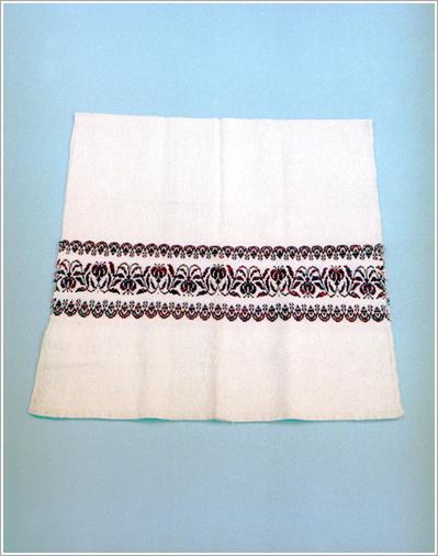 Origin: Békéscsaba Technique: Homespun made of white cotton, a row of black and red pomegranates on one end, the other is drawn, hand-sewed. SIZE: L: 120 cm W: 60 cm