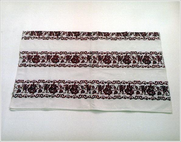 Origin: Tótkomlós Technique: A homespun made of cotton yarn, sewed from two sheets, decorated with rose and black, red cross -fibred motifs. Size: L: 125 cm W: 150 cm