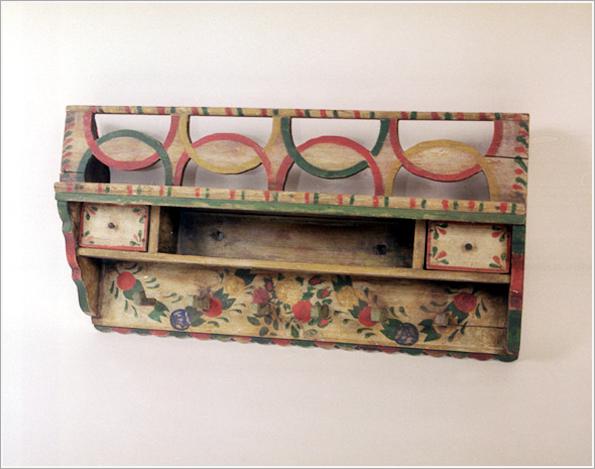 Origin Békéscsaba Technique: made of pine wood, row of hangings, red, blue, yellow flowers onyellowish basis Size: L: 77 cm W: 19.5 cm H: 39 cm