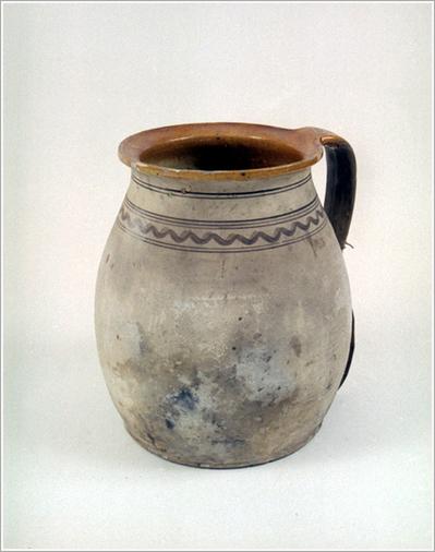 Origin: Békéscsaba Technique: Unglazed outside, light-brown glazed rim, a wavy and six parallel lines around. Size: H: 28.5 cm Orifice: 20 cm Bottom: 15 cm