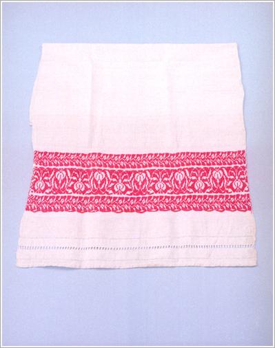 Origin: Békéscsaba Technique: Linen homespun with cross-fibred red cotton, motifs of pomegranates, drawn ends. Size: L: 102 cm W: 58 cm