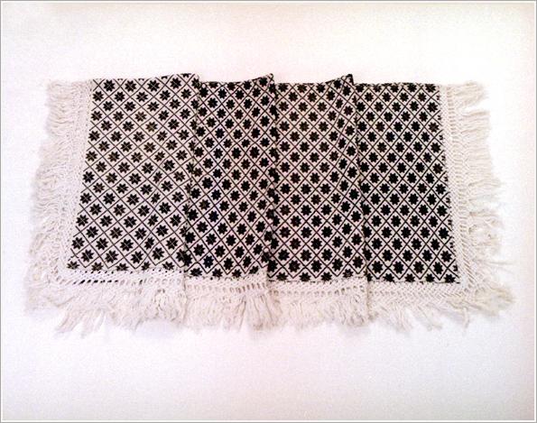 Origin: Békéscsaba Technique: Homespun sewed from two sheets made from white cotton, weaved motifs of stars, knotted fringes at the edges.Size: L: 135 cm W: 117 cm Length of fringes: 17 cm