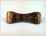 knot pin Origin: Tótkomlós Technique: Made from brass-sheet, finger-biscuit shaped, bended ends, decorated with dotted and knocked motif of a tulip. Size: L: 11 cm W: 3.5 cm |
