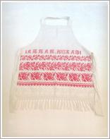 kneading apron "Origin: Békéscsaba Technique: White homespun sewed from linen, four rows of red, cross-fibred ornaments, at the end of ""Gálik Marka"" drawn, fringed. Size: L: 78 cm W: 56.5 cm" |