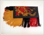 shawl Origin: Tótkomlós Technique: Black silk, with red and yellow bunches of flowers at the corners and red, yellow, black fringes. Size: L: 170 cm W: 170 cm |