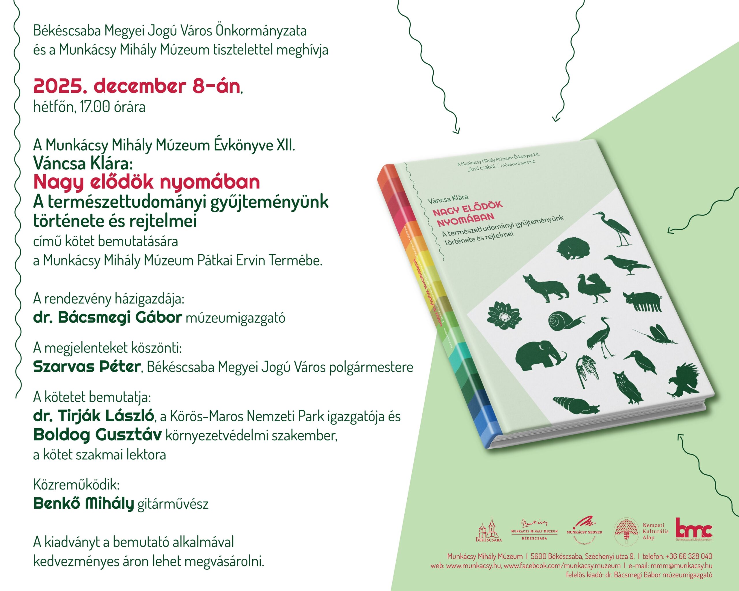 Szeretettel várunk minden érdeklődőt 2025. december 8-án, hétfőn 17.00-tól múzeumunk idei évkönyvének, Váncsa Klára: Nagy elődök nyomában. A természettudományi gyűjteményünk története és rejtelmei című kötetének bemutatójára, a Munkácsy Mihály Múzeum Pátkai Ervin Termébe.